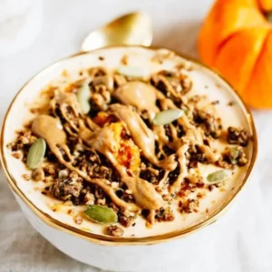This pumpkin pie yogurt bowl is made with protein-packed, calcium-rich Greek yogurt, pumpkin puree (loaded with vitamin A and antioxidants), pumpkin pie spice, maple syrup, and all your favorite toppings for the perfect nutritious fall breakfast!